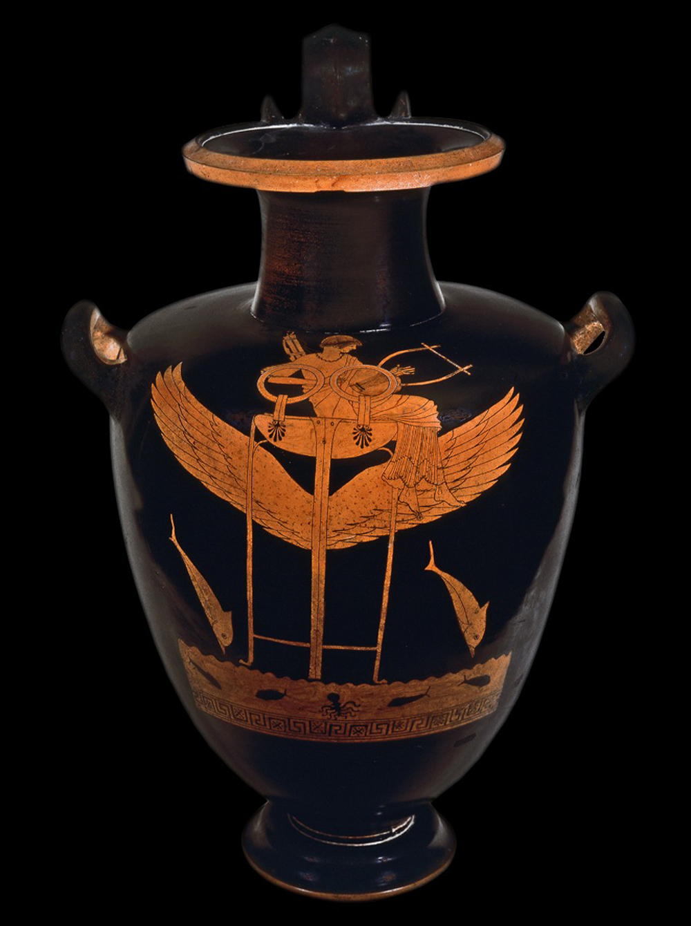 Ὁ θεὸς Ἀπόλλων καθισμένος σὲ πτερωτὸ τρίποδα ταξιδεύει πρὸς τὴν Ὑπερβορέα, πετῶντας πάνω ἀπὸ τὴν θάλασσα. Ἀττικὴ ἐρυθρόμορφη ὑδρία, 490 – 460 π.Χ. / 4ος αἰ. μ.Ὀ., Γρηγοριανό Ἐτρουσκικὸ Μουσεῖο, Βατικανό.