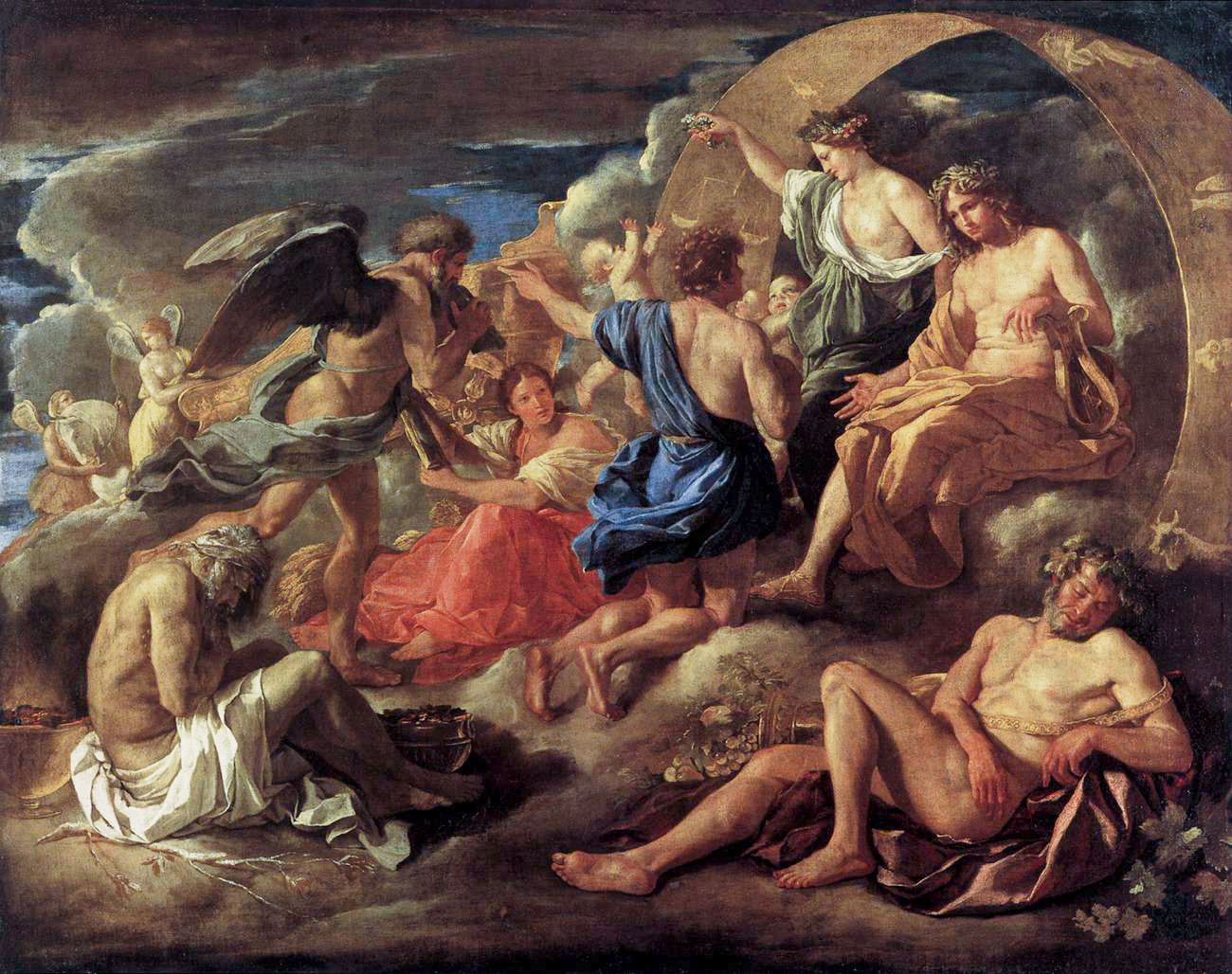 Ὁ χορὸς τῶν Ἐποχῶν ὑπὸ τὴν μουσικὴ τοῦ Χρόνου, ἐνῶ ὁ Ἥλιος μὲ τὸ ἇρμα του διατρέχει τὸν οὐρανό. Πίνακας τοῦ ζωγράφου Νικολὰ Πουσσίν (Nicolas Poussin).