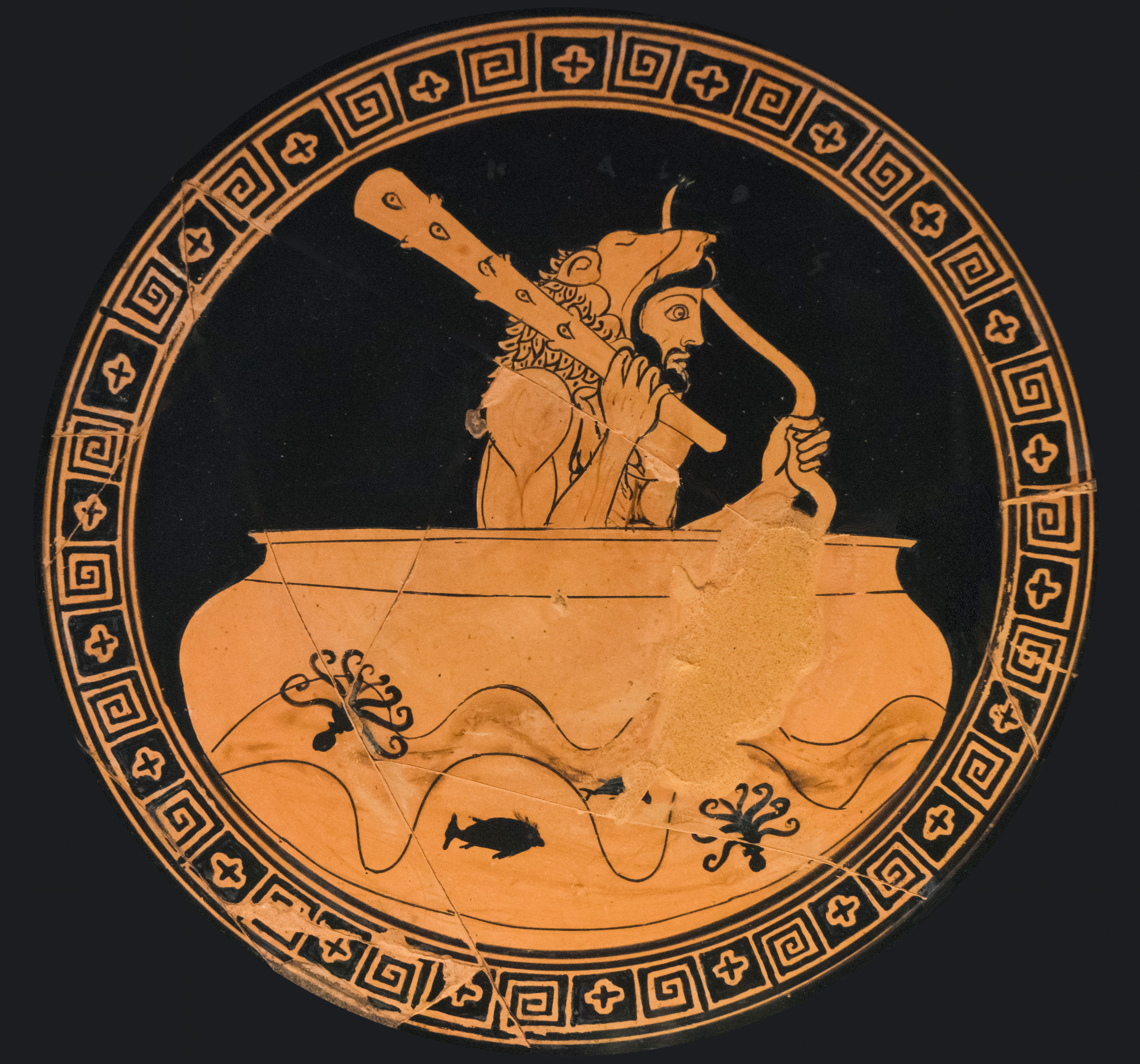 Ὁ Ἡρακλῆς διασχίζει τὸν Ὠκεανὸ μὲ τὴν βάρκα τοῦ θεοῦ Ἥλιου. Ἀττικὴ ἐρυθρόμορφη κύλιξ, περὶ τὸ 480 π.Χ. / 296 μ.Ὀ., Οὐωλκοὶ (σημερινὸ Vulci), Γρηγοριανὸ Ἐτρουσκικὸ Μουσεῖο, Μουσεῖα Βατικανοῦ, Ρώμη.