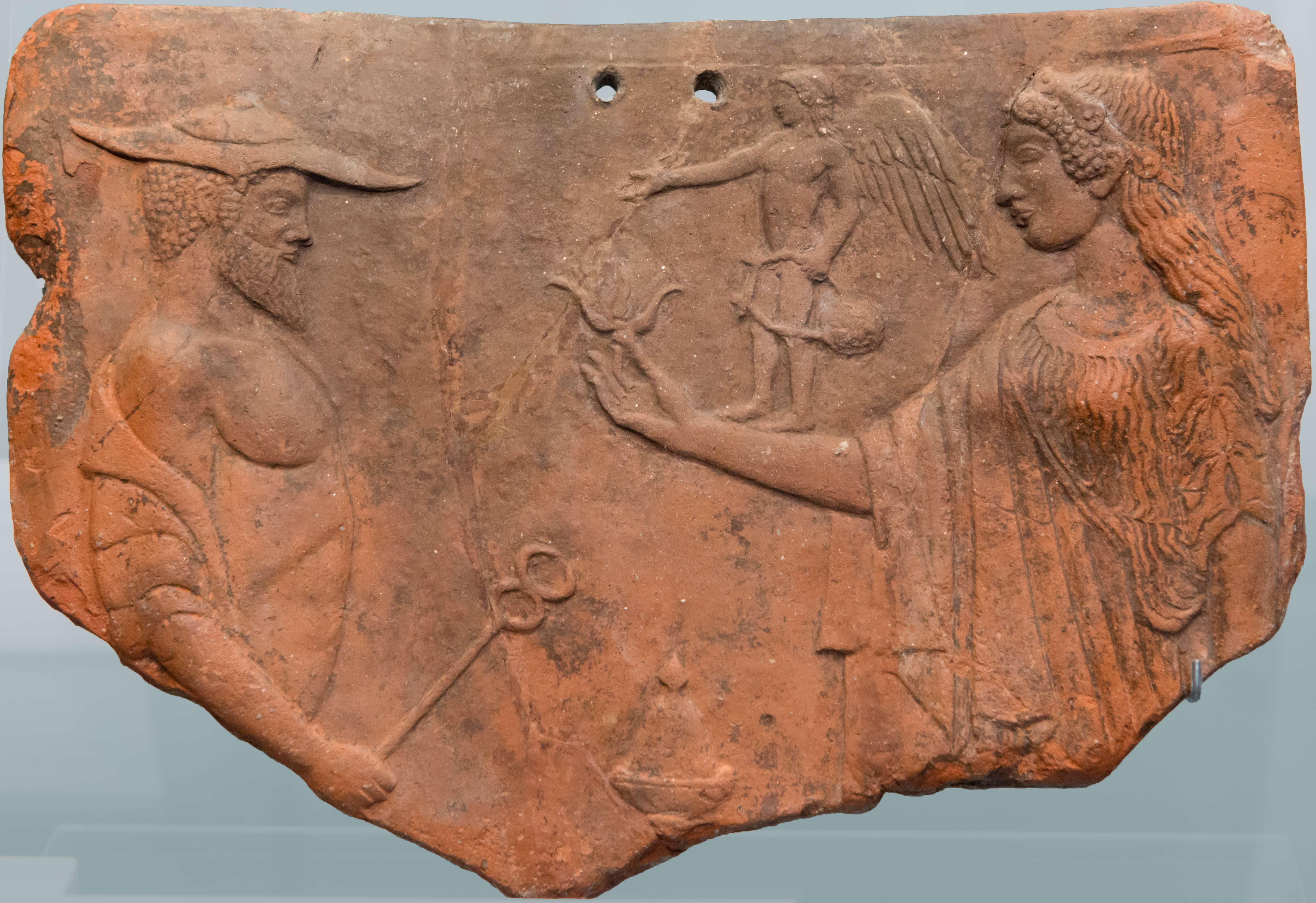 Οἱ θεοὶ Ἑρμῆς καὶ Ἀφροδίτη μὲ πτερωτὸ Ἔρωτα. Πήλινο ἀναθηματικὸ ἀνάγλυφο περὶ τὸ 475 – 450 π.Χ. / 301 – 316 μ.Ὀ., Λοκροί, Καλαβρία, Συλλογὴ Ἀρχαιοτήτων, Μόναχο.