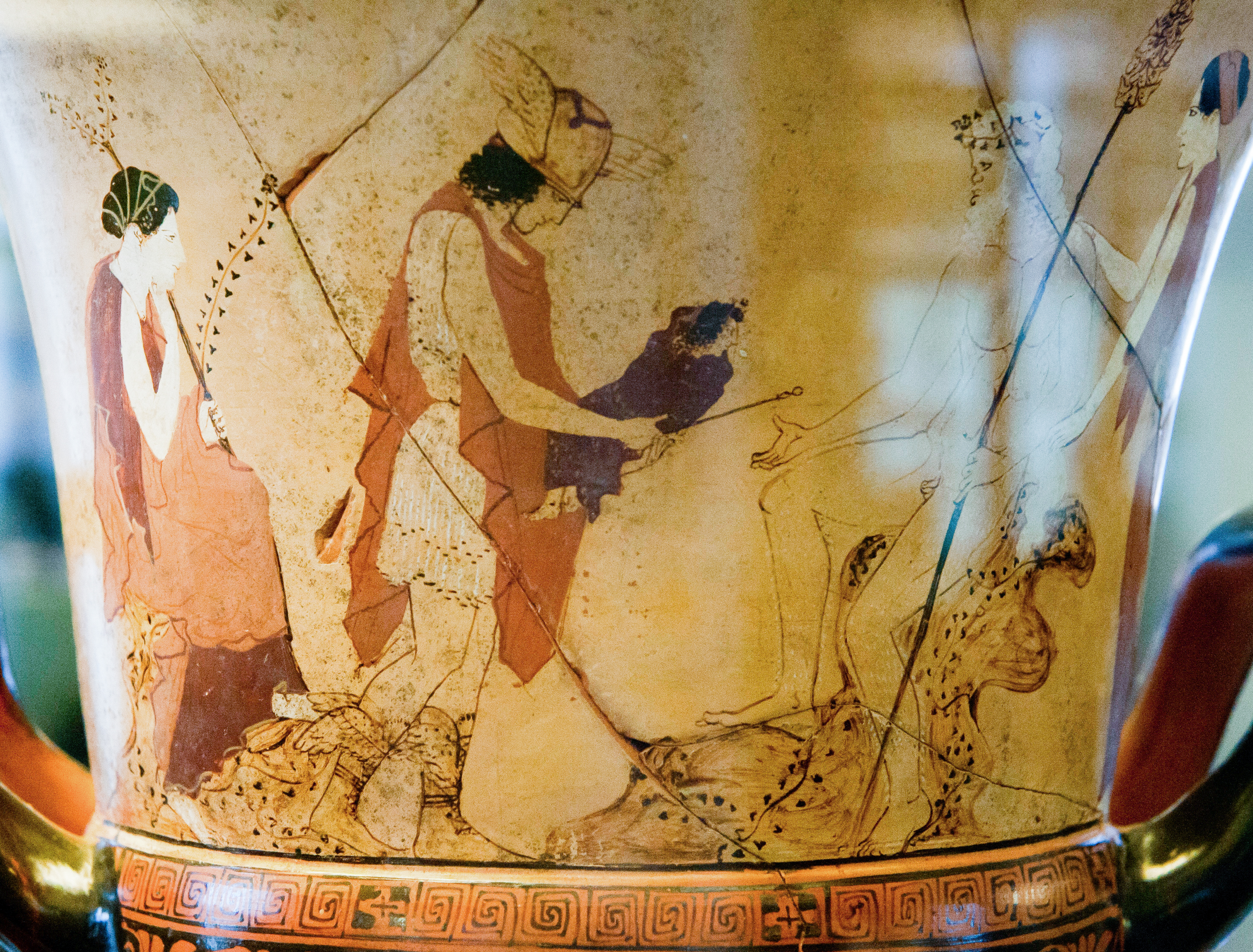 Ὁ θεὸς Ἑρμῆς ἐπιβλέπει καθὼς ὁ Ὕπνος καὶ ὁ Θάνατος μεταφέρουν τὴν σωρὸ τοῦ ἥρωος Σαρπηδῶνος εἰς τὸν Ἅδη. Ἀττικὴ ἐρυθρόμορφος κρατῆρας, περὶ τὸ 515 π.Χ. / 261 μ.Ὀ., Ρώμη.