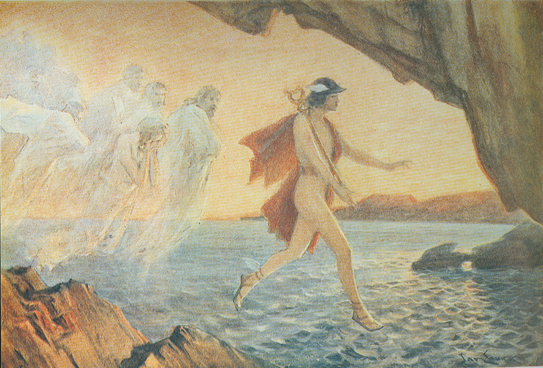 Ὁ θεὸς Ἑρμῆς ὀδηγεῖ τοὺς νεκροὺς μνηστῆρες εἰς τὸν Ἄδη. Πίνακας τοῦ ζωγράφου Ἴαν Στύκα (Ian Styka).