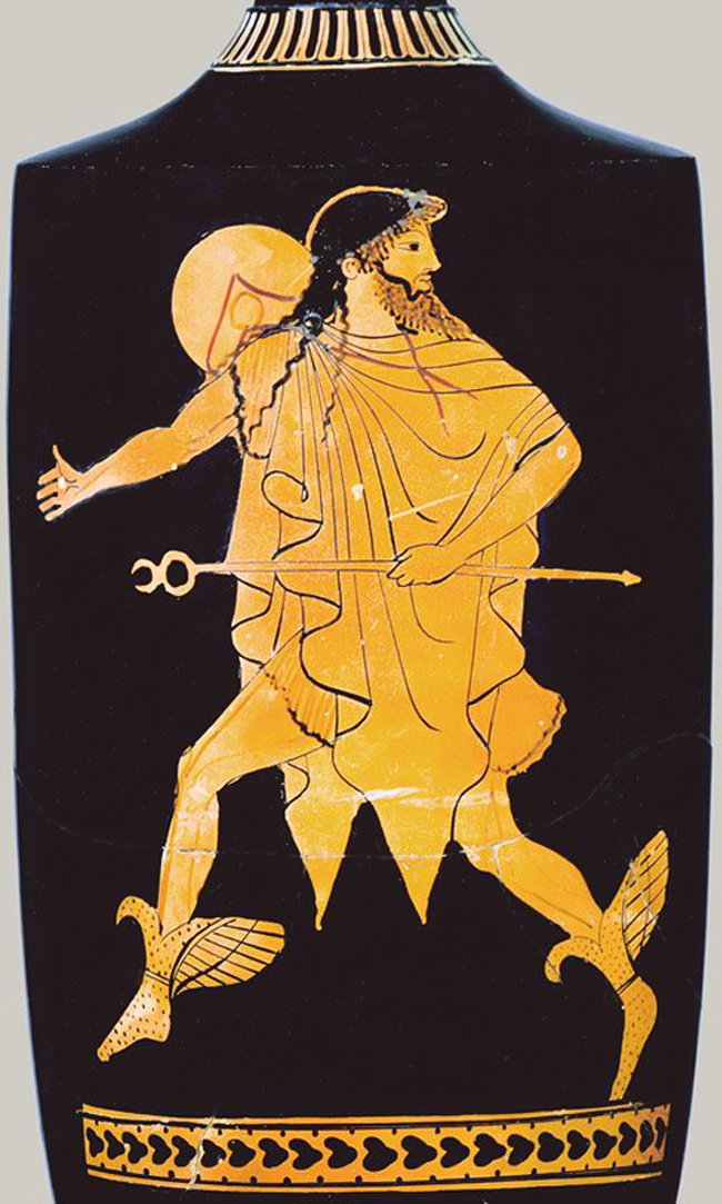 Ἑρμῆς Κήρυξ, μὲ πτερωτὰ ὑποδήματα καὶ τὸν χαρακτηριστικό του πέτασο, φέρων κηρύκειο. Ἀττικὴ ἑρυθρόμορφη λήκυθος, περὶ τὸ 450 – 400 π.Χ. / 326 – 376 μ.Ὀ., Γρηγοριανὸ Ἑτρουσκικὸ Μουσεῖο, Μουσεῖα Βατικανοῦ, Ρώμη.