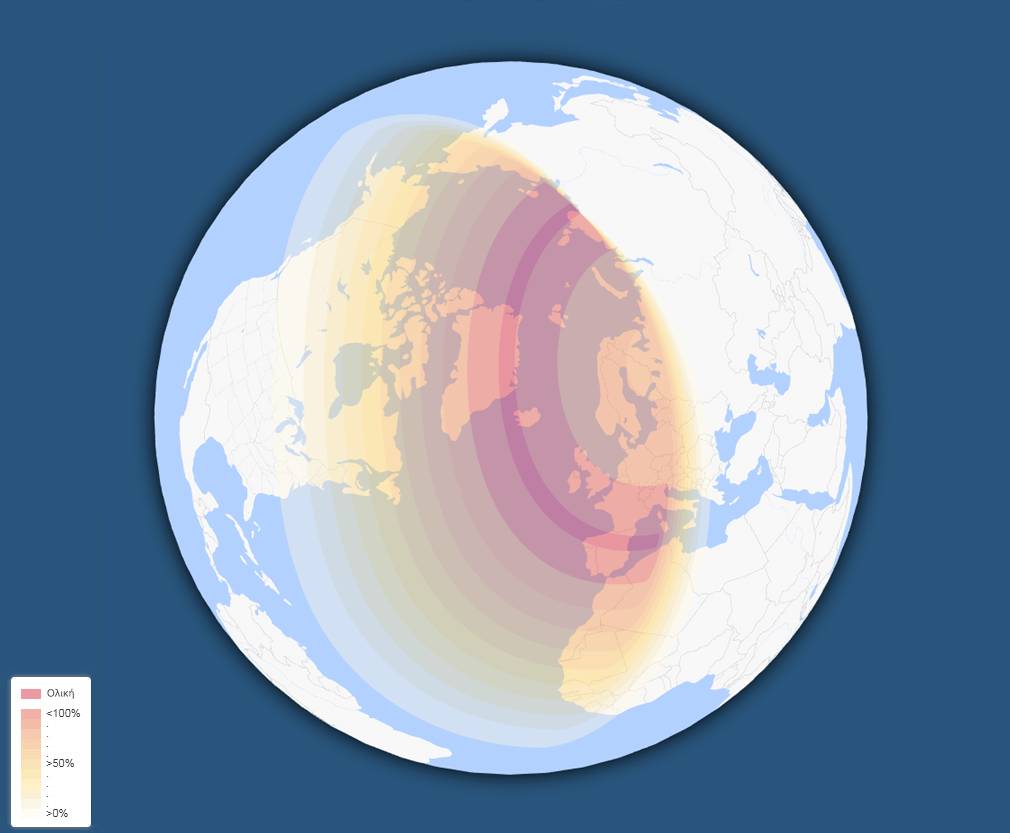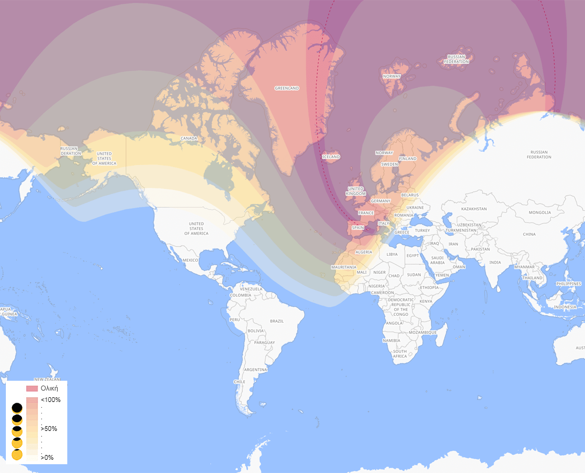 12.08.26 Ἡ ὁλικὴ ἔκλειψη τοῦ Ἀπριλίου θὰ εἶναι ὁρατὴ κυρίως ἀπὸ τὴν δυτικὴ Εὐρώπη, τὴν Ἀλγερία καὶ τὴν Γροιλανδία. Ἡ ἔκλειψη θὰ εἶναι μερικῶς ὁρατὴ εἰς τὸ βόρειο μέρος τοῦ Ἀτλαντικοῦ Ὠκεανοῦ, τὴν Κεντρικὴ Εύρώπη, τὴν Λευκορωσσία, τὶς Βαλτικὲς καὶ Σκανδιναυικὲς χῶρες, τὴν Φινλανδία καὶ τὴν βορειοδυτικὴ Ρωσσία.