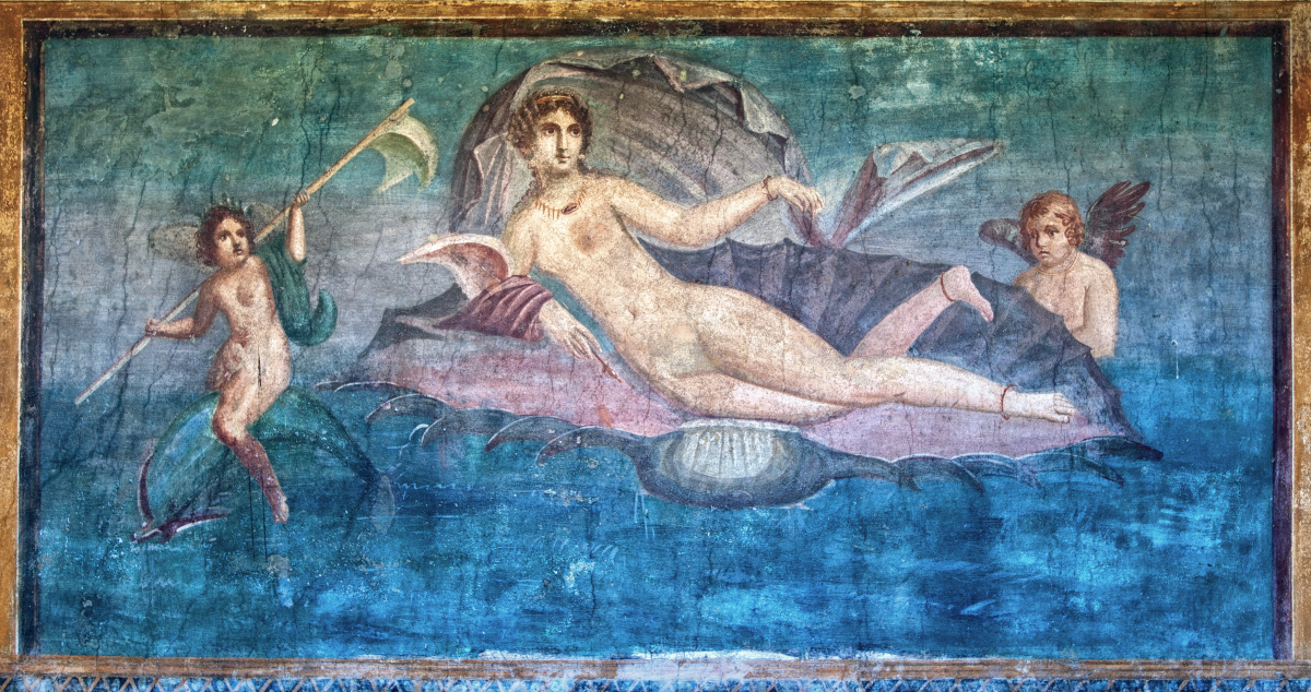 Ἡ Ἀφροδίτη σὲ θαλάσσιο ὄστρακο συνοδευόμεη ἀπὸ τὸν Ἔρωτα καὶ ἕναν ἐνάλιο ἀκόλουθο σὲ δελφίνι, τοιχογραφία περὶ τὸ 460 π.Χ. ἀπὸ τὴν Πομπηία, Συλλογὴ Λουντοβίζι.
