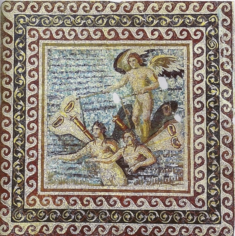 Ὁ Ἔρως στέκεται στὰ πτερὰ δύο ψυχῶν, ὀδηγῶντας τες, ψηφιδωτό, 3ος αἰ. μ.Χ., Οἰκία τῶν Ψυχῶν, Δάφνη (προάστιο) τῆς Ἀντιόχειας. Ἀρχαιολογικὸ Μουσεῖο Χατάϊ, Τουρκία.