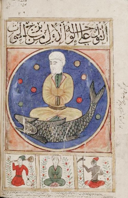 Ὁ ἀστερισμὸς τῶν Ἰχθύων καὶ οἱ τρεῖς δεκανοί ἀπὸ τὸ Kitab Al Bulhan (Βιβλίον τῶν Θαυμάτων), χειρόγραφο περὶ ἀστρολογίας, ἀστρονομίας, γεωμαντείας τοῦ Ἄμπντ ἀλ-Χασὰν Ἂλ Ἰσφαχανὶ (Abd al-Hasan Al-Isfahani), 1390.
