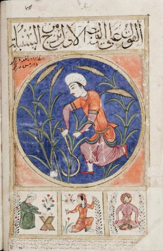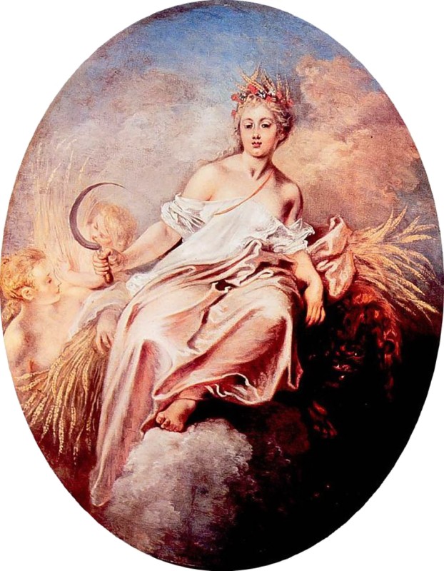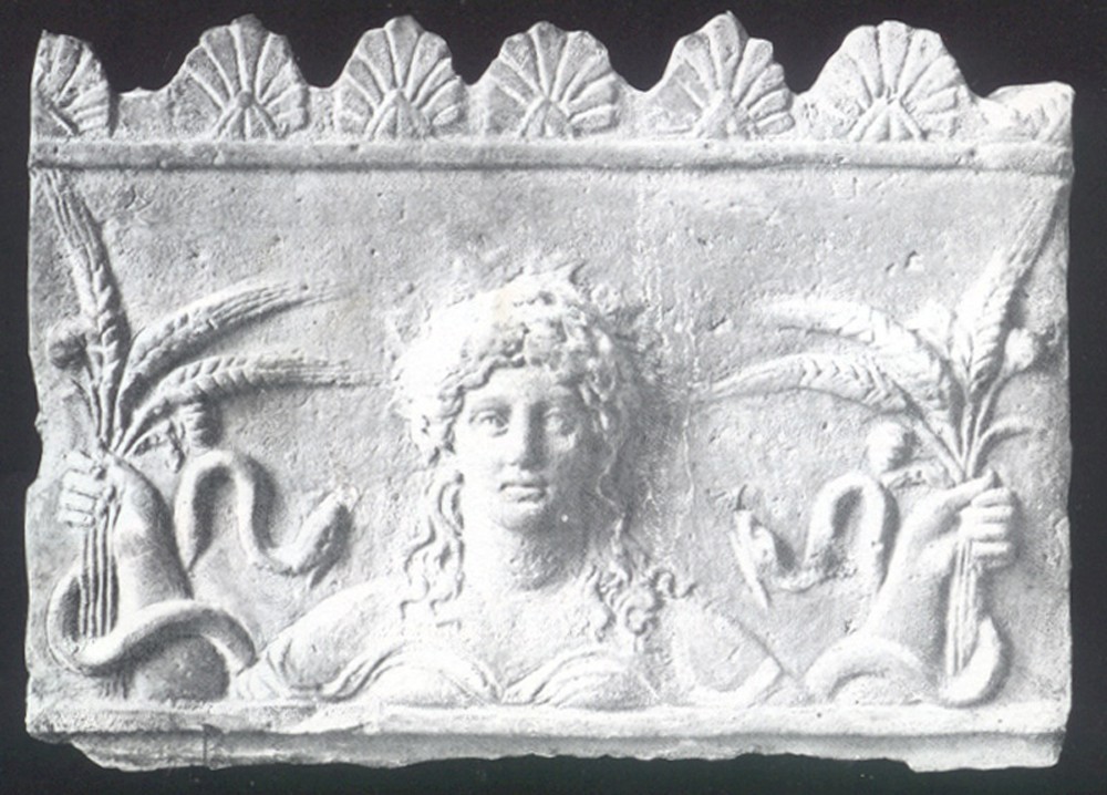 Ὁ Τριπτόλεμος, φέρων στάχυ καὶ σκῆπτρο, ἀναχωρεῖ ἐπὶ πτερωτοῦ ἅρματος ἱνὰ διδάξῃ τὴν γεωργία τοῖς ἀνθρώποις, σταλθεῖς ὑπὸ τῶν θεῶν Περσεφόνη καὶ Δήμητρα. Ἀττικὴ ἐρυθρόμορφη ὑδρία, περὶ τὸ 450 π. Χ. / 4ος αἰ. μ. Ὀ., Κρατικὲς Συλλογὲς Ἀρχαιοτήτων (Staatliche Antikensammlungen), Μόναχο.