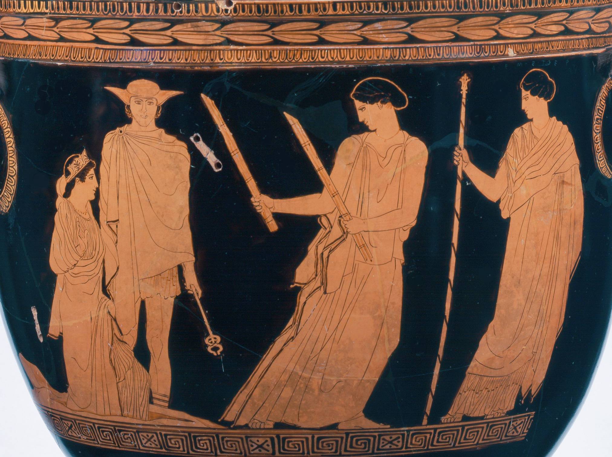 Ἡ ἄνοδος τῆς Περσεφόνης συνοδευόμενη ἀπὸ τὸν Ἑρμῆ, τὴν Ἑκάτη δαδοῦχο καὶ τὴν Δήμητρα σκηπτοῦχο. Ἀττικὸς ἐρυθρόμορφος κρατῆρας, περὶ τὸ 440 π.Χ. / 336 μ.Ὀ., Μητροπολιτικὸ Μουσεῖο Νέας Ὑόρκης.