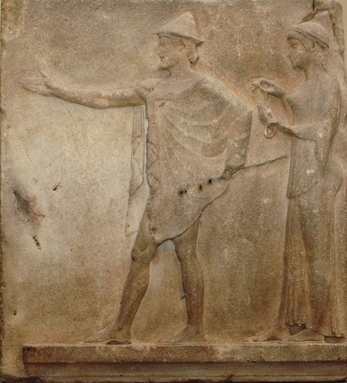 Ἑρμῆς Ἀγοραῖος καὶ Χάριτες. Μαρμάρινο ἀνάγλυφο, μὲ ἐπιγραφὴ ὅτι στὶς Χάριτες δὲν πρέπει νὰ θυσιάζῃ κανεῖς οὔτε αἴγα οὔτε χοῖρο, ἀπὸ τὸ πέρασμα τῶν Θεωρῶν τῆς Ἀγορᾶς τῆς Θάσου, περὶ τὸ 480 π.Χ. / 296 μ.Ὀ., Θάσος, Μουσεῖο Λούβρου.