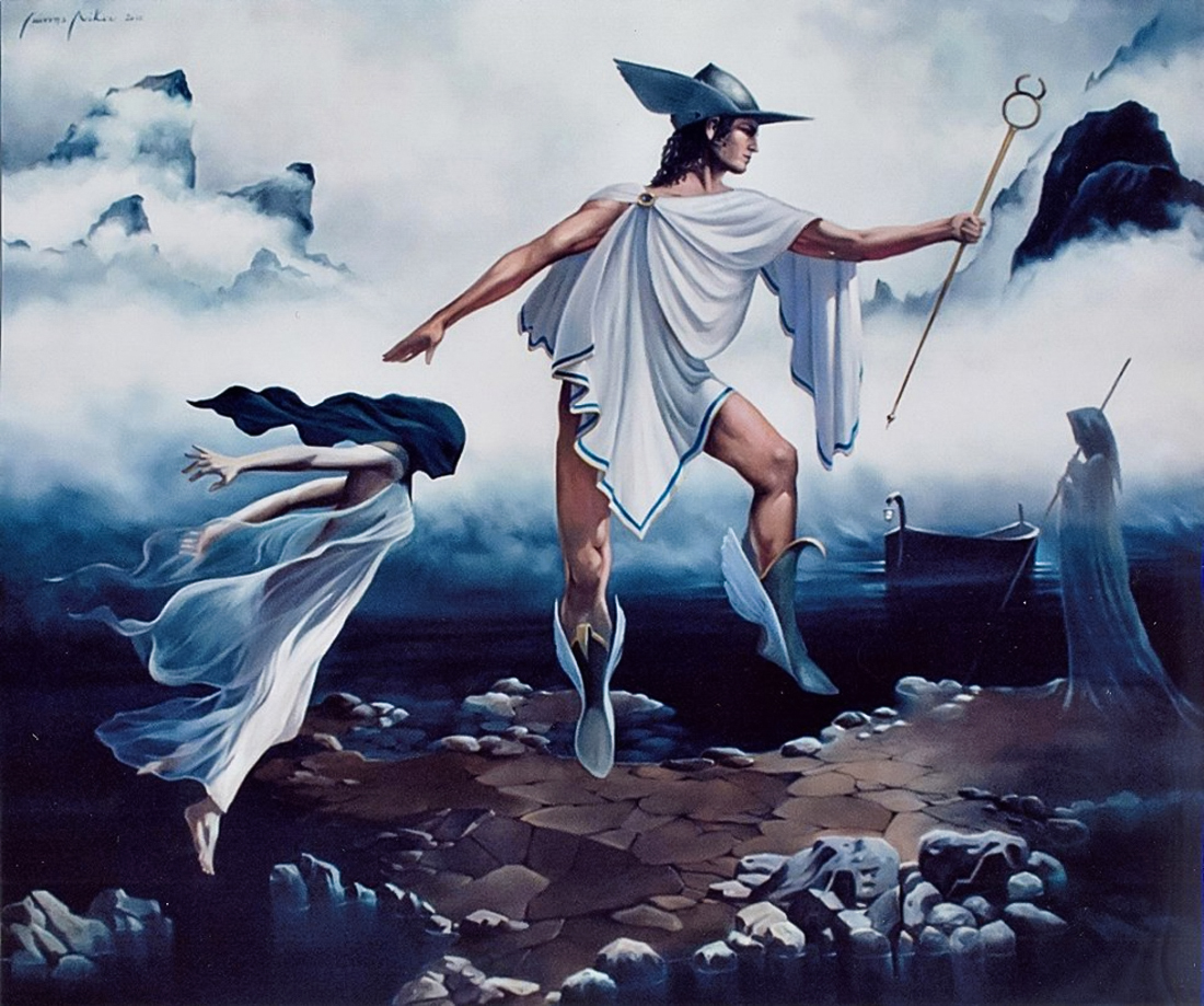 Ὁ θεὸς Ἑρμῆς Ψυχοπομπός. Πίνακας τοῦ σύγχρονου ζωγράφου Γιάννη Νίκου. @