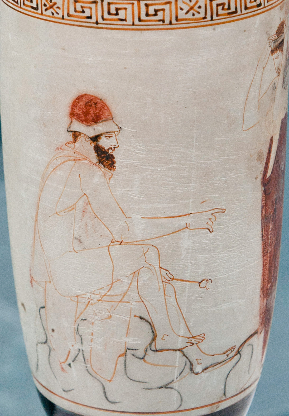 Ὁ Ἑρμῆς Χθόνιος, Ψυχοπομπός, περιμένει τὴν ψυχὴ μίας νεκρῆς γυναικός, ποὺ στολίζεται καθ’ ὅδον πρὸς τὸν Ἅδη. Λευκὴ ἐρυθρόμορφη λήκυθος, περὶ τὸ 440 π.Χ. / 336 μ.Ὀ., Συλλογὴ Ἀρχαιοτήτων, Μόναχο.