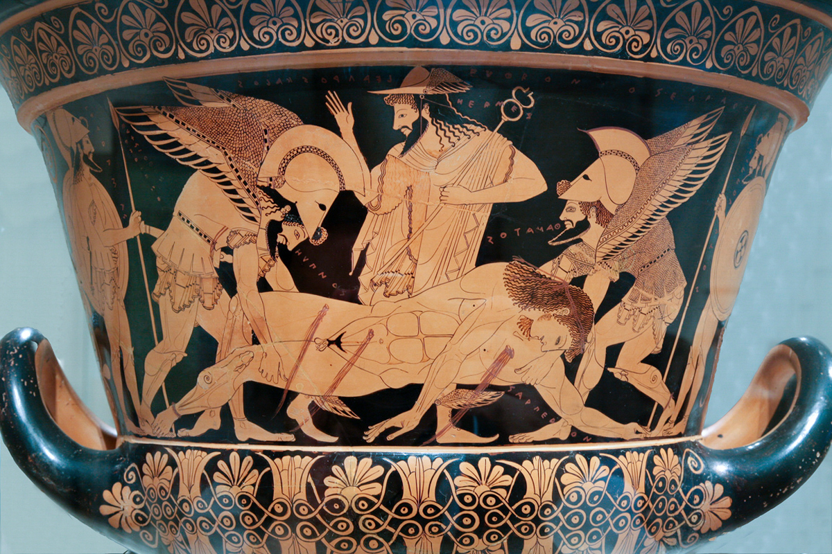 Ὁ θεὸς Ἑρμῆς ἐπιβλέπει καθὼς ὁ Ὕπνος καὶ ὁ Θάνατος μεταφέρουν τὴν σωρὸ τοῦ ἥρωος Σαρπηδῶνος εἰς τὸν Ἅδη. Ἀττικὴ ἐρυθρόμορφος κρατῆρας, περὶ τὸ 515 π.Χ. / 261 μ.Ὀ., Ρώμη.