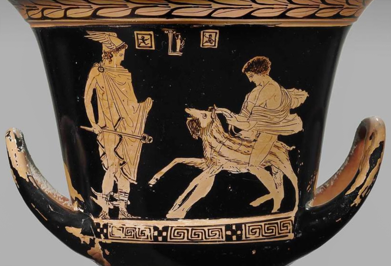 Νεαρὸς ἄντρας φέρει αἴγα πρὸς θυσία εἰς τὸν θεὸ Ἑρμῆ. Ἀττικὴ κύλιξ ἢ κρατήρ, περὶ τὸ 425 – 420 π.Χ. / 351 – 356 μ.Ὀ., Μουσεῖο Καλῶν Τεχνῶν, Βοστώνη.